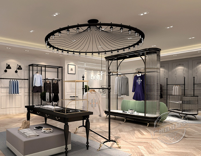 此店的玻璃服裝展柜主要材質(zhì)為玻璃和金屬。玻璃服裝展柜的頂部、底部、支架等結(jié)構(gòu)部位采用不銹鋼材質(zhì),而側(cè)面和前面則采用鋼化超白玻璃材質(zhì)。整店采用簡約、時尚的設計風格,以突出展示服裝的效果。內(nèi)部配備有燈光、展示架、吊桿等展示配件,以便于展示服裝的效果更加突出。