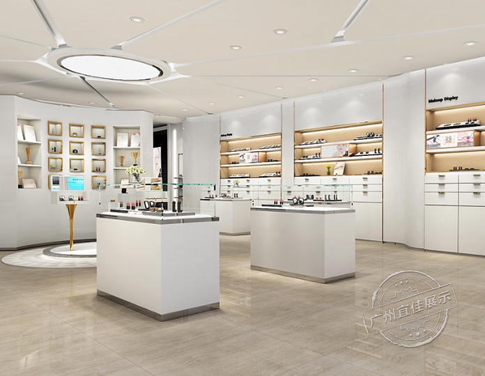 DERIK 化妝品玻璃展柜設計方案為商場店形式,柜臺均采用純木質白色亮光烤漆,純白色LED燈,及透明鋼化玻璃相結合,彰顯化妝品的檔次,化妝品中島制作[宜佳展示]采用木質烤漆和不銹鋼制作,全面提升視覺效果,凸顯品位高端質感。