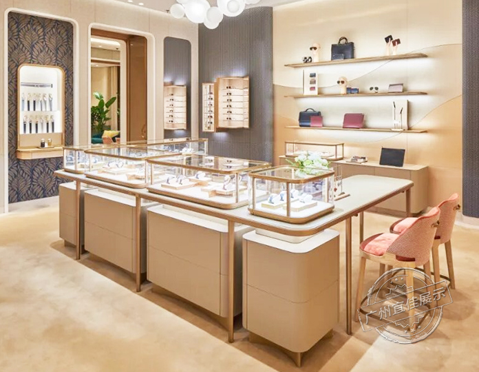 宜佳展示將品牌珠寶按種類、款式和價(jià)位進(jìn)行分類展示陳列。島式展示柜主要展示熱門款式和特色產(chǎn)品,方便顧客從各個(gè)角度欣賞。壁掛式展示柜用于系列展示,利用墻面空間設(shè)置小型展示架,用于展示小型珠寶及相關(guān)配飾。在設(shè)計(jì)細(xì)節(jié)方面,奢華定制玻璃展柜采用標(biāo)志性的米色和金色組合,營(yíng)造出溫馨奢華的氛圍。珠寶展柜定制線條簡(jiǎn)潔流暢,采用頂級(jí)超白低鐵玻璃,透明度高,防紫外線性能優(yōu)異,完美呈現(xiàn)珠寶的色澤和細(xì)節(jié),同時(shí)有效保護(hù)其免受光線損傷??蚣懿捎脙?yōu)質(zhì)不銹鋼,經(jīng)宜佳進(jìn)行特殊工藝表面處理,呈現(xiàn)細(xì)膩的金屬光澤,確保珠寶展柜定制穩(wěn)固的同時(shí),更增添奢華質(zhì)感。