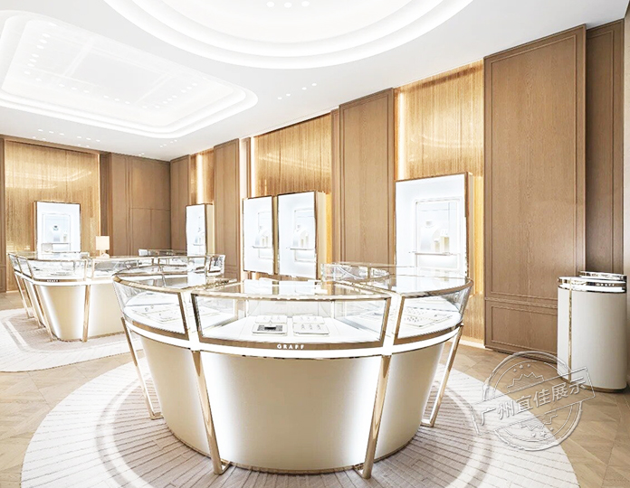 GRAFF高端珠寶展柜設(shè)計(jì)陳列造型多樣(如圓形、弧形、嵌入式等),可靈活組合,滿足不同珠寶系列(如婚慶珠寶、高端定制珠寶)的陳列需求,同時(shí)與店鋪布局(如開放式布局、分區(qū)陳列)完美融合,提升空間縱深。宜佳展示設(shè)計(jì)精準(zhǔn)照明,彰顯珠寶魅力,珠寶展示柜定制照明系統(tǒng),配備內(nèi)置LED射燈。柔和均勻的光線精準(zhǔn)聚焦于珠寶的切面、光澤和細(xì)節(jié),增強(qiáng)寶石的璀璨光澤和立體感,營造出夢(mèng)幻奢華的展示效果,使每件珠寶都成為視覺焦點(diǎn)。