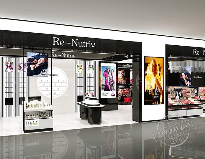 [宜佳展示]40000㎡實力廠家,在此店的化妝品展柜上,采用簡單的黑白配色+YJPY漆面工藝,如鋼琴版絲滑,配上通透的大理石地板,讓人視感得以放松,同時顯示出高端質(zhì)感。