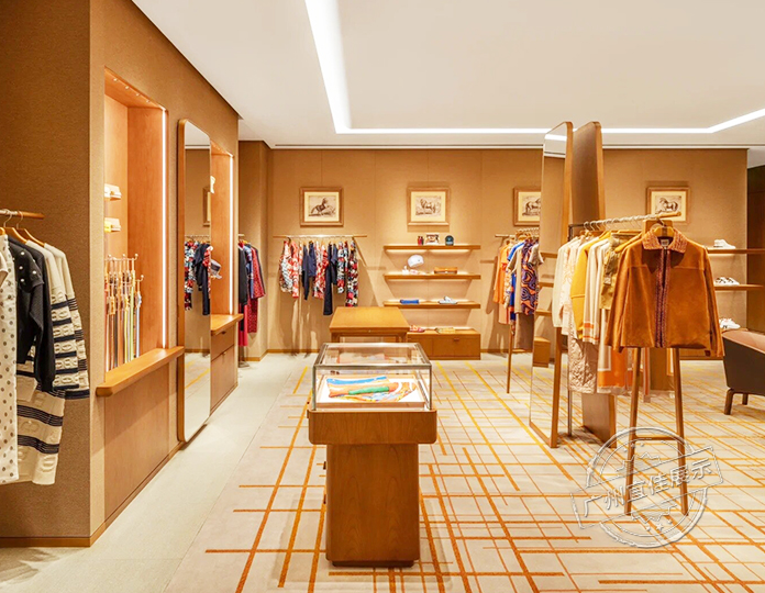 奢侈品服裝展柜定制的陳列創(chuàng)意以奢華為主題,融入品牌經典的色彩與元素,體現(xiàn)品牌悠久的歷史與深厚的文化底蘊。柜體框架采用優(yōu)質實木,經過精心打磨和特殊處理,呈現(xiàn)出溫暖的質感與自然的紋理,經久耐用且環(huán)保,彰顯品牌對品質的承諾。服裝展柜以品牌經典的橙色為主色調,醒目而極具辨識度。臺面采用優(yōu)質皮革包裹,質感細膩,觸感舒適,與實木框架相得益彰,提升了柜體的優(yōu)雅,增強了空間的明亮簡潔。采用優(yōu)質天然材料與精細工藝,打造舒適、優(yōu)雅、極具辨識度的購物空間,讓顧客充分感受到品牌的魅力與生活方式。