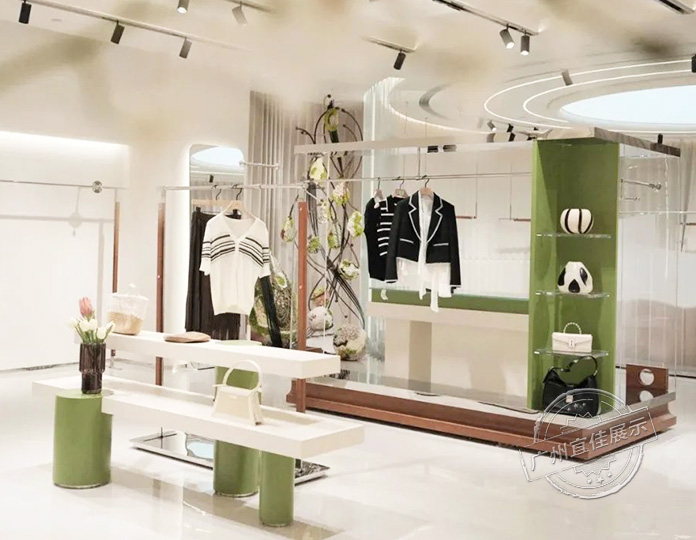 進入X.YING展廳,面積達200平方米。淺米色系的主調(diào)與局部的中古綠相結合,營造出一種優(yōu)雅復古的氣氛。根據(jù)空間布局,不同于一般服裝店的需求,展廳中間的場地需要經(jīng)常舉辦公司審樣會、特賣會等活動,因此主要以可移動的中島服裝展柜為主。此處設計還增加了L型中島掛桿組合和具有儲物功能的飾品柜,以滿足未來大面積店鋪的中島需求。