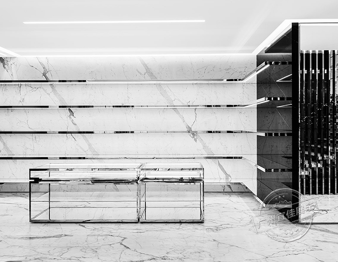 在極簡黑白的色調(diào)中,加以大量的鏡面、鋼化玻璃、不銹鋼元素,呈現(xiàn)出簡潔、高端的空間氛圍。鏡面和不銹鋼以相同的材質(zhì)和形式來呈現(xiàn),如局部吊頂、奢侈品展柜造型、隔斷墻等。
